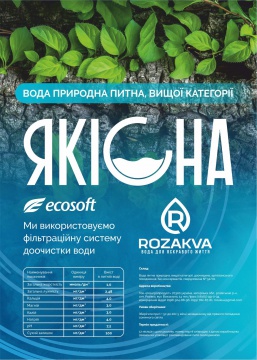 ТМ"Rozakva " Представляем артезианскую питьевую воду «Якісна», ТМ"Rozakva" .Мы работаем на проф.оборудовании.Вода добывается из артезианской скважины, расположенной в с. Святотроицкое Розовского р-на Запорожской обл.на глубине 360 м. Очистительная система" ecosoft"специально ориентирована на исключительно природный состав воды. Осуществляем доставку в радиусе до 50 км. 5 тонн.(5000 л.) Приглашаем к сотрудничеству дистрибьюторов,дилеров,торговых представителей,а так же транспортные компании .