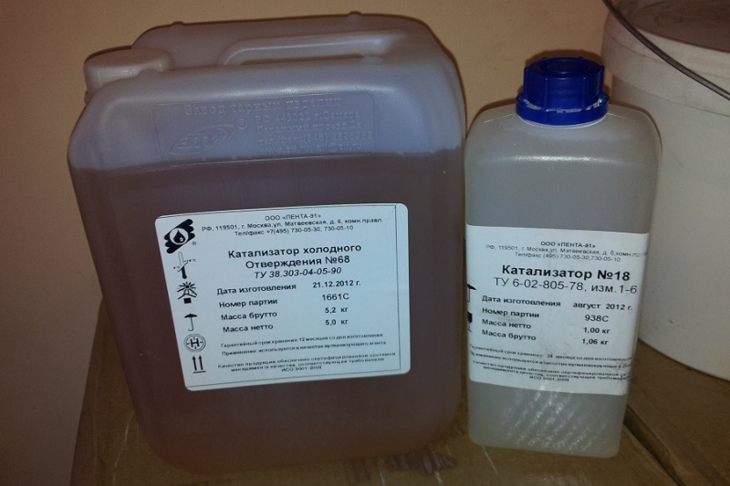 Постоянно в продаже со склада в г. Харькове катализатор №68 (ТУ 38.303-04-05-90) средней активности и катализатор № 18 (ТУ 6-02-805-78) высокой активности, использующиеся в качестве вулканизирующего компонента для отверждения при комнатной температуре кремнийорганических герметиков, компаундов и связующих на основе низкомолекулярных силоксановых каучуков. Применяются при изготовлении компаундов Виксинт К-68, Виксинт К-18, Виксинт ПК-68, Виксинт ПКФ-68, герметик У-1-18, Виксинт КТ-73, Пентэласт-711, Пентэласт-712 и других герметиков. Представляют собой прозрачную жидкость от бесцветного до светло-желтого цвета без посторонних включений и механических примесей. Допустимо незначительное помутнение раствора. Время жизнеспособности кремнийорганического герметика, смешанного с катализатором в некоторой степени можно регулировать процентным отношением пасты к катализатору. При увеличении рекомендованного заводом-производителем количества катализатора время полимеризации уменьшается, но увеличивается хрупкость полученного герметика.