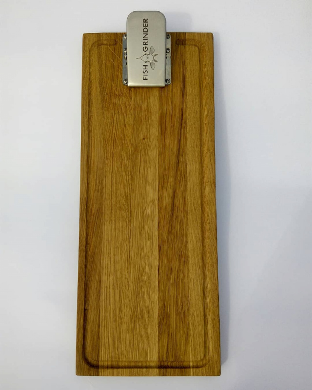 Доска для чистки рыбы с зажимом для хвоста. Материал: дуб и нержавейка. Дерево обработано специальной пропиткой. Размер - 500 х 200 х 20 мм. На нижней части - антискользящие пятки из пищевой резины, диаметром 30 мм.