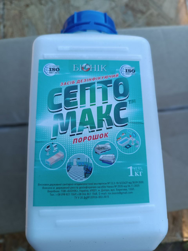 Септомакс: багатокомпонентний поліфункціональний дезінфікуючий засіб з миючим ефектом. Основною діючою речовиною є 1,3-дихлор 5,5-диметилгидантоїн. Засіб випускається у вигляді сипучого порошку від білого до світло-жовтого кольору з помірним запахом хлору. Засіб має протимікробні, противірусні та фунгіцидні властивості. Водні розчини "СЕПТОМАКС" прозорі, безбарвні, мають слабкий запах хлору. Робочі розчини засобу не пошкоджують об´єкти, які виготовлені з металу, скла, гуми, полімерних матеріалів, дерева, кахлю, порцеляни, фаянсу, а також поверхні медичних приладів і устаткування з лакофарбовим, гальванічним та полімерним покриттям, не фіксують білкові забруднення на поверхні виробів медичного призначення, добре змиваються, не залишають нальоту. В складі засобу є речовини, які максимально захищають користувача від шкідливого впливу хлору, не знижуючи ефективності його дії. "СЕПТОМАКС" призначений для: - проведення поточної та заключної дезінфекції у лікувально-профілактичних установах різного профілю (відділення лікарень, поліклініки, реабілітаційні центри, госпіталі, амбулаторії, диспансери, процедурні кабінети та у вогнищах інфекційних хвороб бактеріальної (ТУБЕРКУЛЬОЗ та особливо небезпечні інфекції - ЧУМУ, ХОЛЕРУ, ТУЛЯРЕМІЮ), вірусної (зокрема грип, парагрип, ротавірусні інфекції, ентеровірусні інфекції у т. ч. поліомієліт, ВІРУСНІ ГЕПАТИТИ та ВІЛ-інфекцію, та грибкові (КАНДИДОЗИ, ДЕРМАТОМІКОЗИ) етіології; -санітарно-технічного обладнання (ванни, раковини, унітази), прибирального інвентарю; -дезінфекції, чищення та дезодорації санітарного транспорту та транспорту для перевезення ХАРЧОВИХ ПРОДУКТІВ; - проведення генеральних прибирань у лікувально-профілактичних, учбових закладах, на соціальних об´єктах, проведення профілактичної дезінфекції в ДИТЯЧИХ ДОШКІЛЬНИХ, УЧБОВИХ ЗАКЛАДАХ; - знезараження об´єктів, вражених пліснявими грибами; - дезінфекції поверхні приміщень при проведенні профілактичної дезінфекції на комунально-побутових об´єктах (БАСЕЙНИ, ГУРТОЖИТКИ,