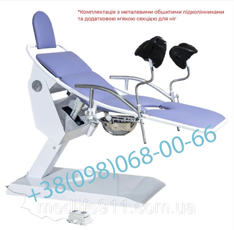 Медичне крісло з електроприводом КГ-3Е (використовується: гінекологія, проктологія, загальна хірургія) Крісло гінекологічне КГ-3Е з одним електроприводом використовується в медичних закладах і являє собою зручне і практичне рішення для оснащення гінекологічних кабінетів, що дозволяє проводити процедури і малі хірургічні втручання максимально комфортно для лікаря і пацієнта. Сидіння крісла, за допомогою електроприводу, приймає найбільш зручне положення, в тому числі Тренделенбург і зворотний Тренделенбург без додаткових зусиль. У спинній секції є відділення для одноразових простирадл. Крісло є цільнозварним. До каркасу кріпиться підставка з нержавіючою чашею. Жорсткі підколінники встановлюються у втулки підніжок і фіксуються затискачами. Підколінники можуть регулюватися по висоті, обертатися навколо вертикальної осі, гойдатися відносно горизонтальної осі. Стандартно крісло КГ-3Е комплектується чашею з нержавіючої сталі, ножною підлоговою педаллю управління і чорними гумовими підколінниками. Габаритні розміри КГ-3Е, ±10мм: довжина - 1350-1400; ширина по ложементах - 850; висота - 1350. В нижньому положенні сидіння відстань до полу, мм - 500; В верхньому положенні сидіння відстань до полу, мм - 1300Кут нахилу - 0-45градусів. Маса крісла, кг – не більше 90. Максимально допустиме навантаження на крісло, кг - не більше 150. Додатково гінекологічне крісло КГ-3Е може комплектуватися: металевими обшитими підколінниками; бежевими або бірюзовими гумовими підколінниками; ручним пультом управління - 1000грн; додатковою м'якою секцією для ніг – 2500 грн; м'яким підлокітником (1 або 2шт) для внутрішніх вливань - 800грн; кольпоскопоутримувачем - від 2500грн (індивідуальний розрахунок); інфузійною стійкою - 590грн; Сходикою - 900грн. Характеристики Основні Виробник Заповіт Країна виробник Україна Колір Синій