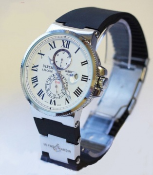 Замечательная копия часов Ulysse Nardin Maxi Marine Chronometer. Корпус: сталь с напылением IPG 18k, полированный; диаметр 45 мм, толщина 12 мм; рифленый рант; защищенная завинчивающаяся заводная головка; задняя крышка на 6 винтах с прозрачным окном. Циферблат: белый, сатинированный, маленькие указатели декорированы круговой резьбой; накладные серебрянные часовые метки в виде римских цифр; позолоченные ромбовидные стрелки "багет" белым светонакопителем. Указатели: окно даты в положении "3 часа" и маленькая секундная стрелка в положении "6 часов", индикатор запаса хода в положении "12 часов". Ремешок: каучуковый; двойная раскладывающаяся застежка с дополнительной кнопочной фиксацией. Цвет: gold, black, silver. Доставка: Новая почта, Укрпочта