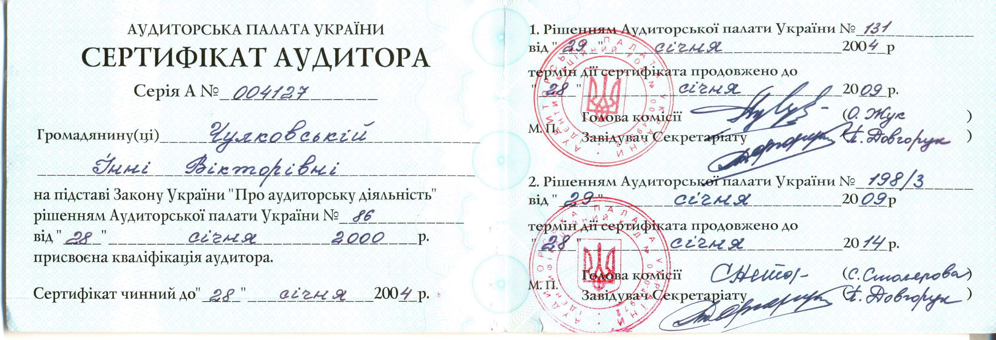 JPG Сертификат аудитора Украины серии А, выданный Чулковской Инне Викторовне от 28.01.2000 г. Сертификат 25-10-2013