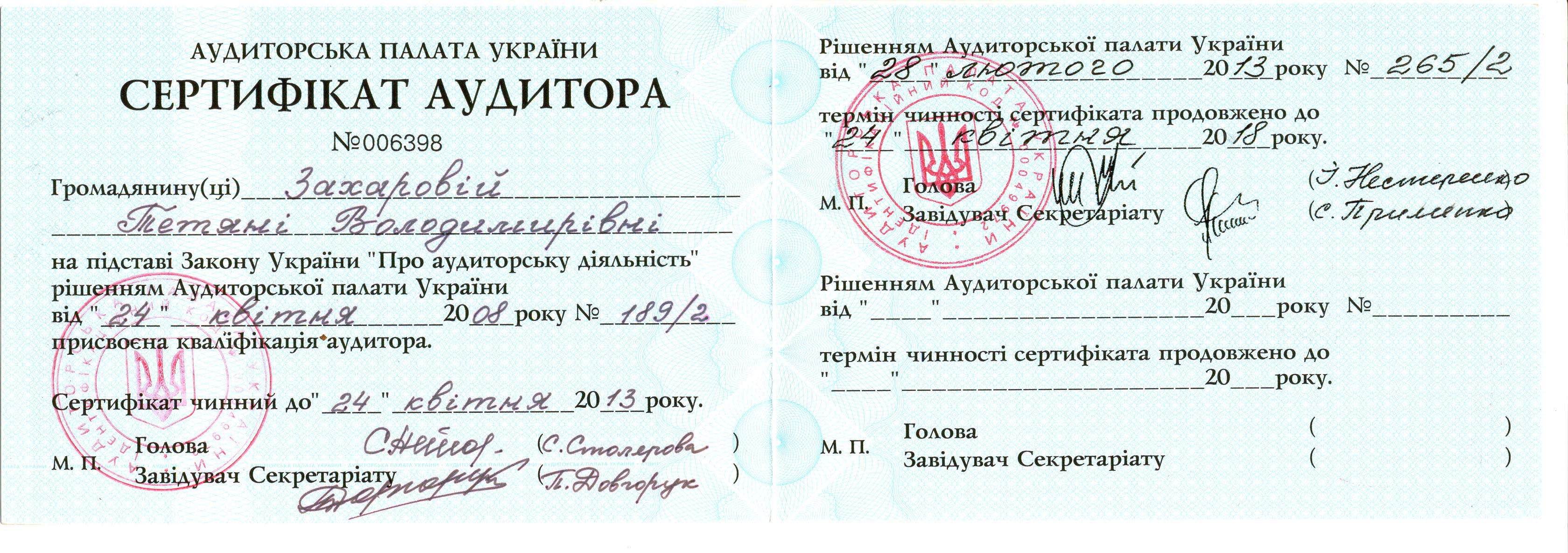 JPG Сертификат аудитора Украины, выданный Захаровой Татьяне Владимировне от 28.01.2000 г. Сертификат 25-10-2013