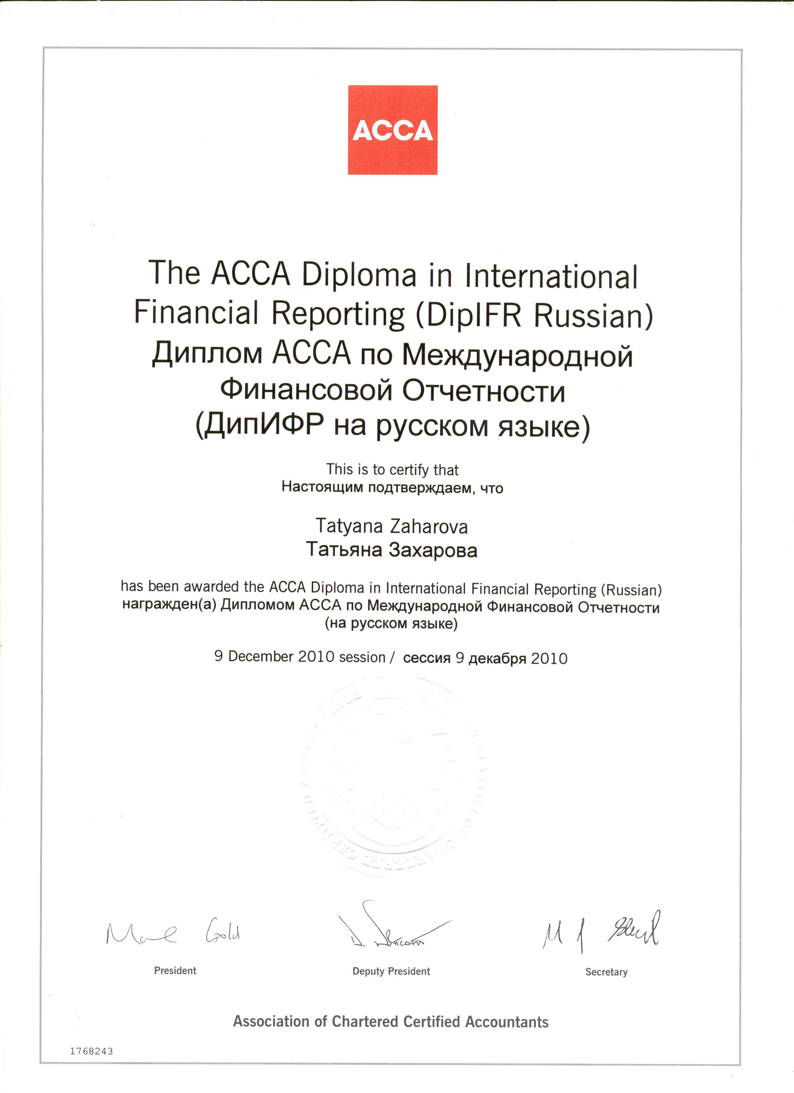 JPG Диплом АССА по Международной Финансовой Отчетности, выданный Захаровой Татьяне Владимировне от 09.12.2010 г. Сертификат 25-10-2013