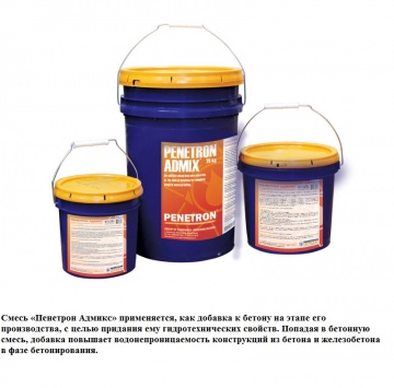 Пенетрон Адмикс - Смесь «Пенетрон Адмикс» применяется, как добавка к бетону на этапе его производства, с целью придания ему гидротехнических свойств. Попадая в бетонную смесь, добавка повышает водонепроницаемость конструкций из бетона и железобетона в фазе бетонирования, а изделий из бетона, на стадии их производства. Использование Пенетрон – Адмикс позволяет исключить последующую гидроизоляцию сооружения. Так как материал добавляется в бетонную смесь во время ее приготовления, и бетон сохраняет все качества гидроизоляции, полученные на первичной форме защиту