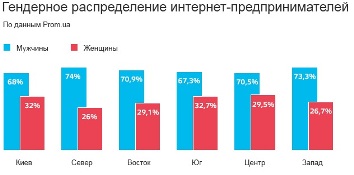 Профиль малого и среднего интернет-предпринимательства Украины в разрезе гендерного распределения фактически однороден – в основном это мужчины. В разных регионах страны мужчины составляют от 68% до 74% от общего числа интернет-предпринимателей региона. Женщин интернет-предпринимателей на порядок меньше – от 26% до 32,7%: