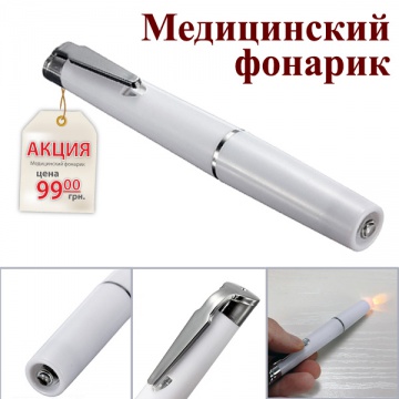 Медицинский фонарик Использование: для определения зрачкового рефлекса, при первичной визуальной диагностике полости рта, для осмотра слизистой носоглотки, гортани, наружного слухового прохода, кожного покрова и др. удобный клип, как у пишущей ручки, позволит закрепить фонарик на кармане халата, блокнота, ежедневника и др.. Особенности медицинского фонарика: • яркий свет • питание – 2 батарейки ААА (не входят в комплект). • включение/отключение – нажатие на клип.